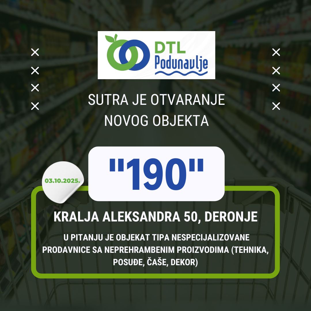Otvoren novi objekat “190” 📣✨ Otvaren novi objekat DTL Podunavlje “190” na adresi:📍 Kralja Aleksandra 50, Deronje. Ovaj objekat je specijalno opremljen za neprehrambene proizvode (tehnika, posuđe, čaše, dekor). https://podunavlje.rs/wp-content/uploads/2025/10/Otvaranje-novog-objekta-190.mp4